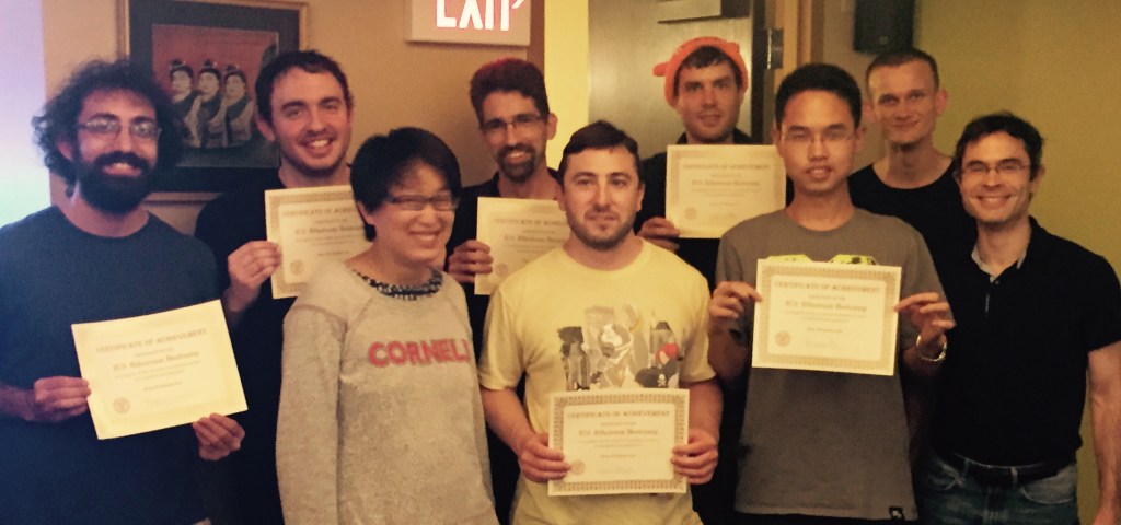 Boot Camp Project Grand Prize Winners: “Add Ethereum Support for Verifying Zero-Knowledge Proofs (SNARKs)”, Left to right: Josh Gancher, Sean Bowe, Elaine Shi (IC3 co-Director), Prof. Eran Tromer, Casey Detrio, Prof. Andrew Miller (IC3 Associate Director), Yuncong Hu, Vitalik Buterin, Ari Juels (IC3 co-Director)