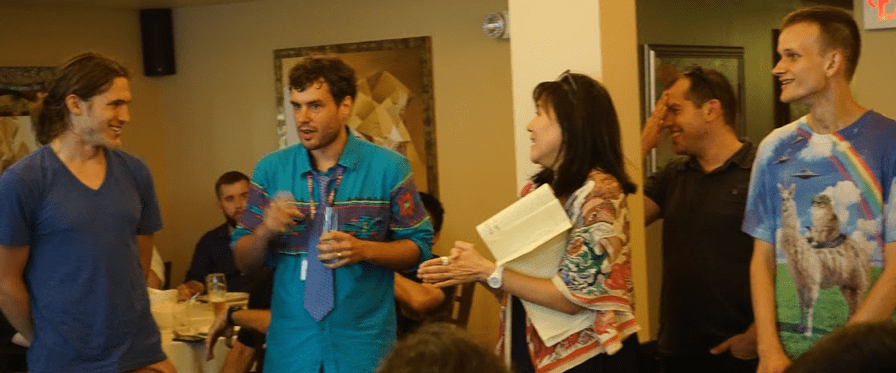 The group gathered after the Celebration Dinner for a photo. Afterwards, several of the participants hung out talking blockchain, shooting pool and enjoying libations until the wee hours.