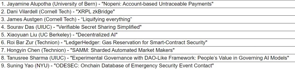 Projects were judged by Sarah Allen (IC3, Flashbots), Patrick McCorry (Arbitrum Foundation), Surya Bakshi (Offchain Labs), Haaroon Yousaf (IC3), Lorenz Breidenbach (Chainlink Labs). The judges based their decisions on novelty, practicality, user experience, technical difficulty, and maturity of development within the week.