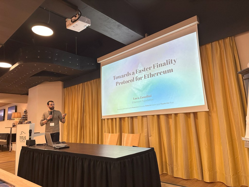 - Luca Zanolini from Ethereum Foundation spoke about a protocol for efficiently finalizing Ethereum blocks. The method he describes finalizes blocks proposed by an honest proposer within three slots, even if other proposers are dishonest, using only one voting phase per slot. Luca says this approach reduces overhead and ensures faster and more predictable block finalization.